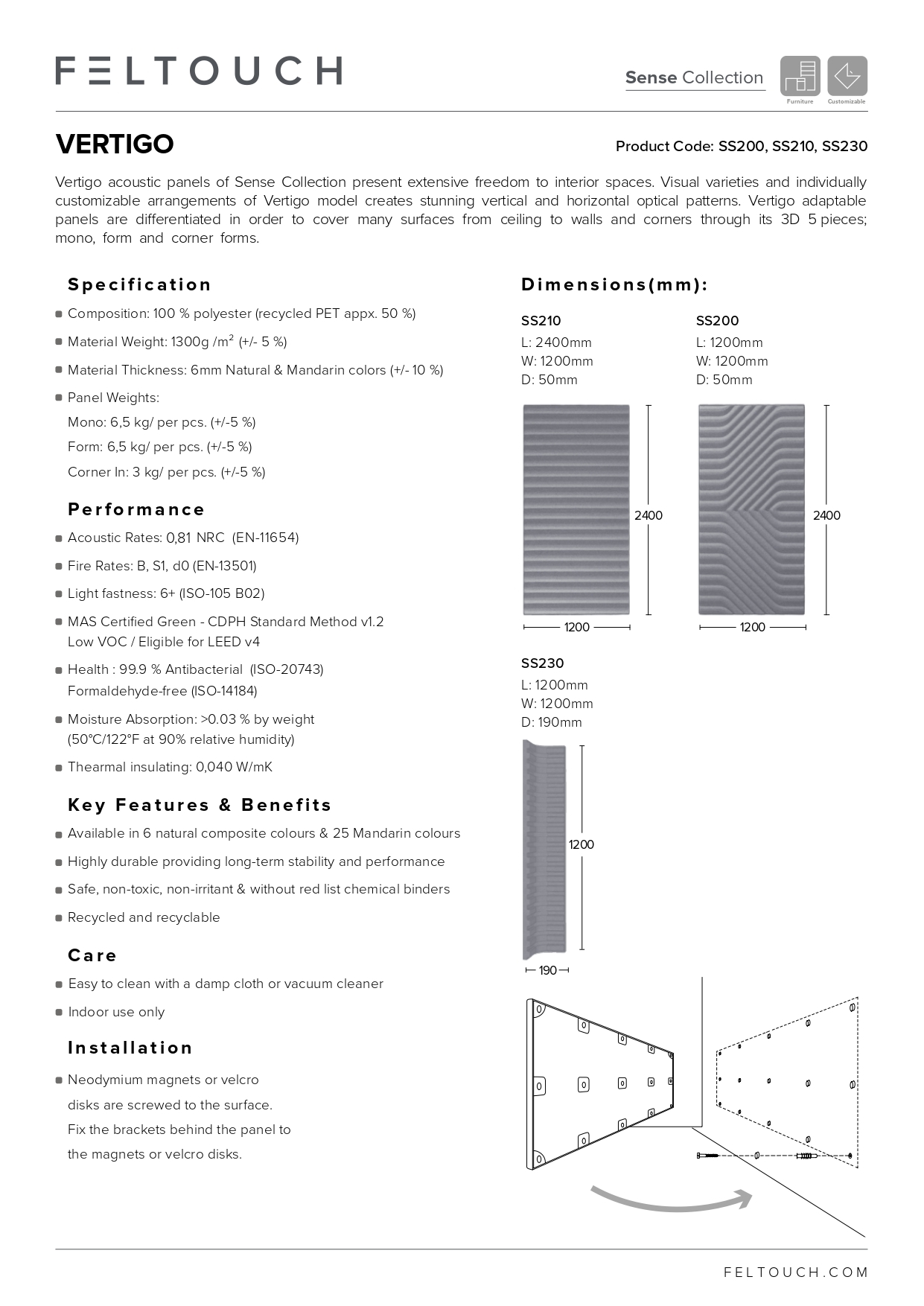 Изготовлены из прессованного переработанного полиэстра - материала, по текстуре напоминающего натуральный войлок. Этот материал обладает рядом неоспоримых преимуществ -высокие акустические характеристики - панели Feltouch имеют класс А звукопоглощения, поэтому их можно использовать в качестве эффективной звукопоглощающей поверхности в различных общественных помещениях -экологичность - материал изготовлен из переработанного полиэстра. Сырьем для панелей являются переработанные пластиковые бутылки. Производя свои продукты, компания Feltouch улучает окружающую среду. -простота уборки - панели Feltouch легко мыть и пылесосить -гипоаллергенность - в отличие от натуральных материалов не вызывают аллергии, а также не выделяют летучих соединений.